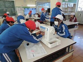 今日は、5年生が家庭科の学習でミシンに挑戦しました。始めるまでの工程が難しいため、学校応援団の方に協力いただいて授業を進めました。動画で下糸をセットするところから針に糸を通すところまでを説明してから、子供たちが実際に取り組みました。何とか全員が糸を通すことができました。
