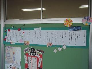 図書室の廊下には、「りっしゅん発けいちつ行き」という糸永えつこさんの詩が飾られています。2月上旬の立春(りっしゅん・春の始まり)から3月上旬の啓蟄(けいちつ・冬ごもりしていた虫たちが土の中から出てくるころ)までの季節の流れを駅にみたてて書かれています。1年間のまとめをしっかりとおこないましょう。図書室に行くときには、ぜひ読んでみてくださいね。(『ふしぎの部屋から』糸永えつこ著・銀の鈴社)