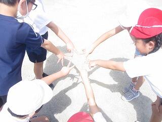 3年生が理科の学習で太陽と影の関係を学習しています。友達同士が手をつないでいると、影も手をつないでいます。みんなでいろいろな影づくりに挑戦しました。太陽との関わりも学んでいます。