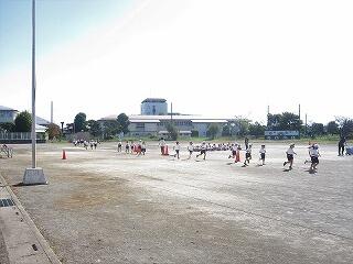 1年生が体育の時間に持久走練習に取り組んでいます。どの子も自分の力に合わせて一生懸命に走っています。誰かと比べるのではなく、自分自身の力を高めることを指導しています。